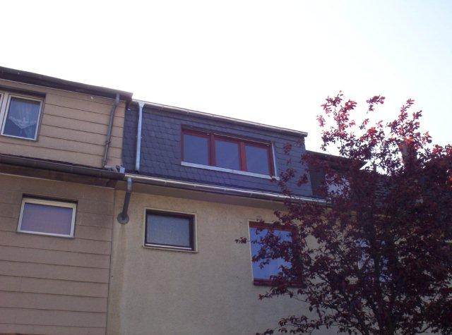 Die vorhandene Gaube wurde während der Arbeiten vergrößert, gedämmt und verschiefert. Zudem wurde ein Austiegsfenster für Wartungsarbeiten auf dem Dach integriert und die Übergänge zum Nachbarn fachgerecht herstellt.